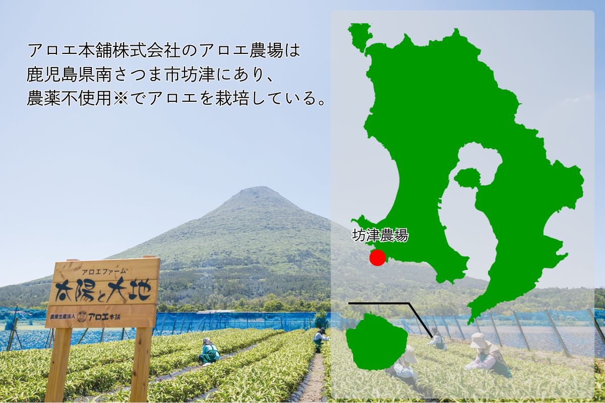 アロエ本舗の農場は鹿児島県南さつま市坊津にあり、適切に管理された畑で高品質なアロエが育てられています。