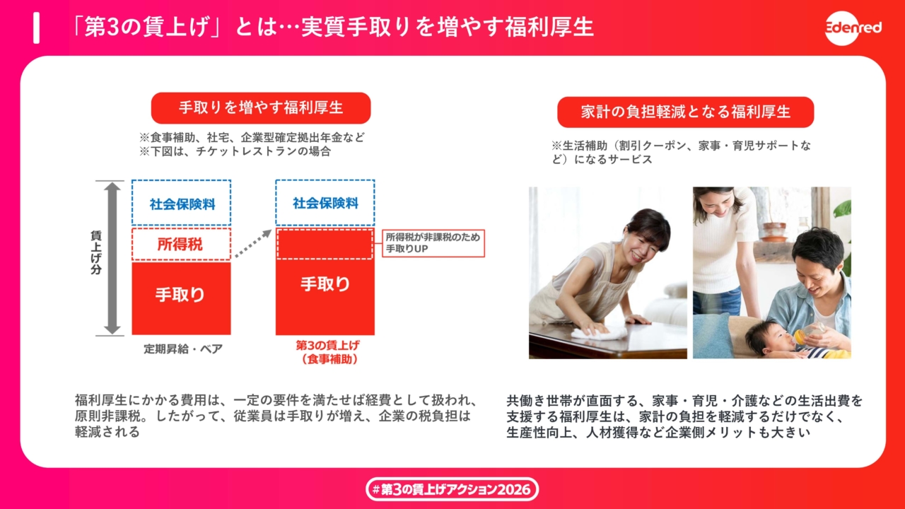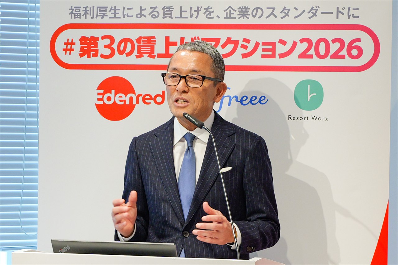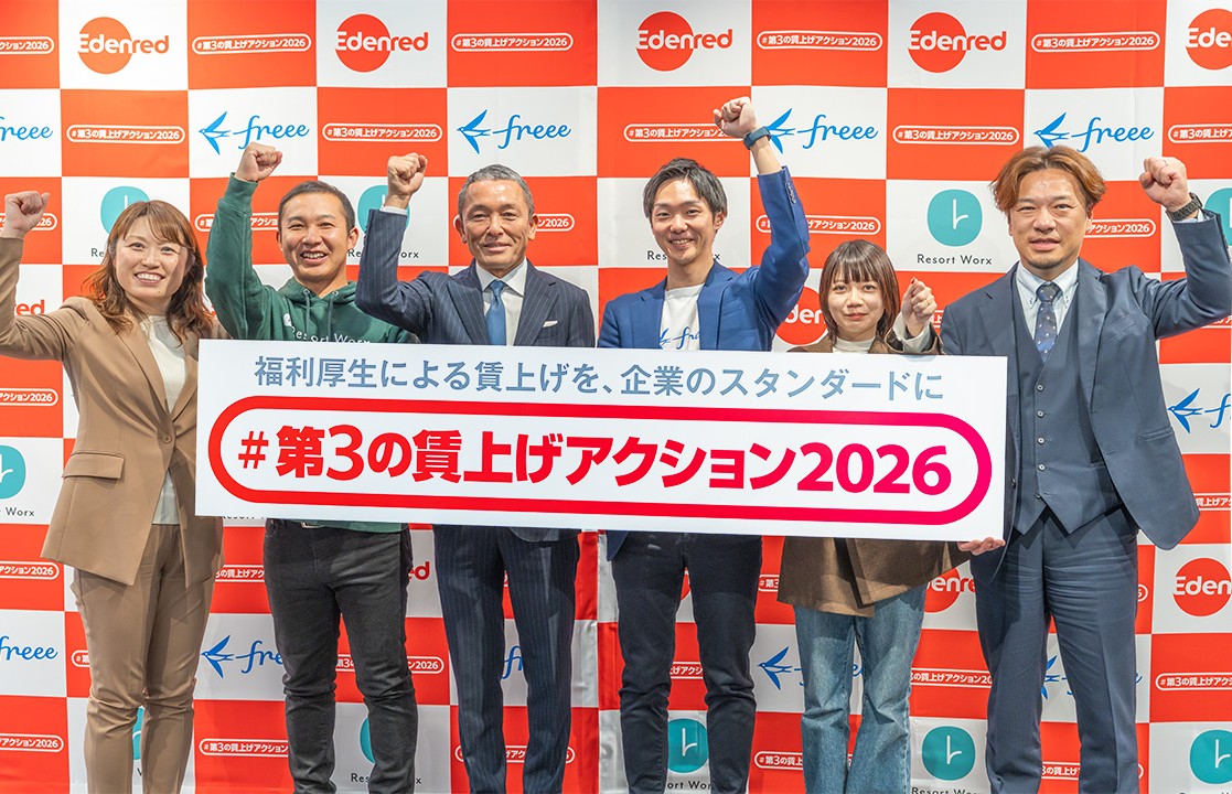 2026年2月12日(木)、食事補助サービスを展開する株式会社エデンレッドジャパン本社にて、「#第3の賃上げアクション2026」発表会が開催された。同社に加え、福利厚生サービスを展開するフリー株式会社、旅行特化型福利厚生を手がける株式会社リゾートワークスが登壇し、賃上げと福利厚生を組み合わせた“ハイブリッド型の手取り向上策”を提案した。