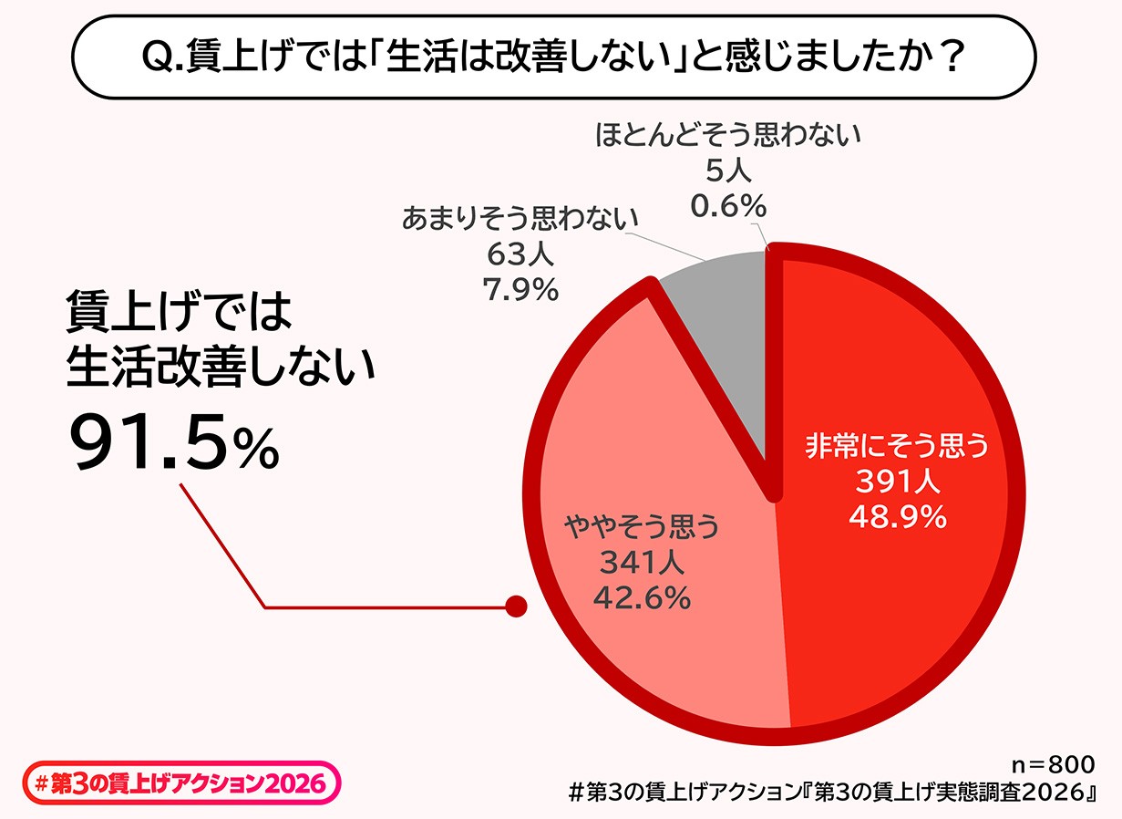 エデンレッドジャパンらがビジネスパーソンを対象に実施した調査によれば、手取り額の上昇を「実感できない」と回答した人は87%超にのぼり、別調査では「賃上げでは生活は改善しない」と返答し、額面上の賃上げと生活実感の間にギャップを感じていることになる。