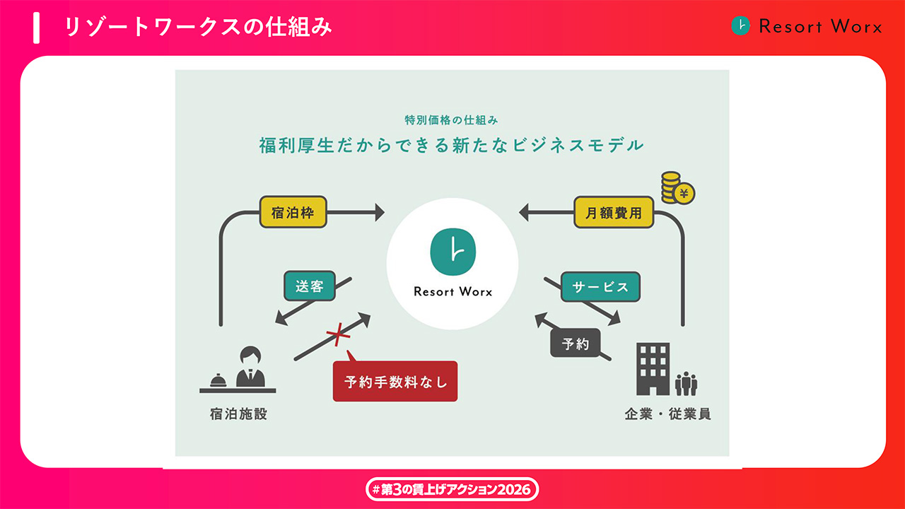 リゾートワークスのサービスでは、従業員が全国の宿泊施設を割引価格で利用できる仕組みを提供している。同社は契約宿泊施設の客室を通年で一定数確保することで、最大80%割引となる格安プランを実現。その結果、宿泊施設側には閑散期や平日においても安定した収益が生まれ、空室対策につながる。