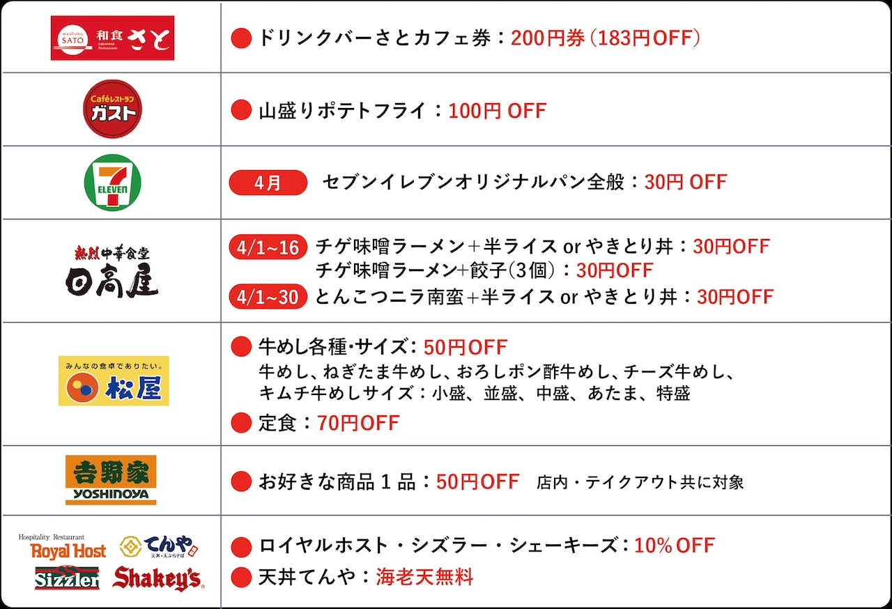 また、株式会社松屋フーズホールディングスや株式会社吉野家も、食事補助が「働く人の活力源」であることを再確認し、制度の普及に賛同。利用促進のため、4月1日より公式アプリを通じて、セブン-イレブン等を含む7社12ブランドで「食のクーポン」の提供を開始しました。