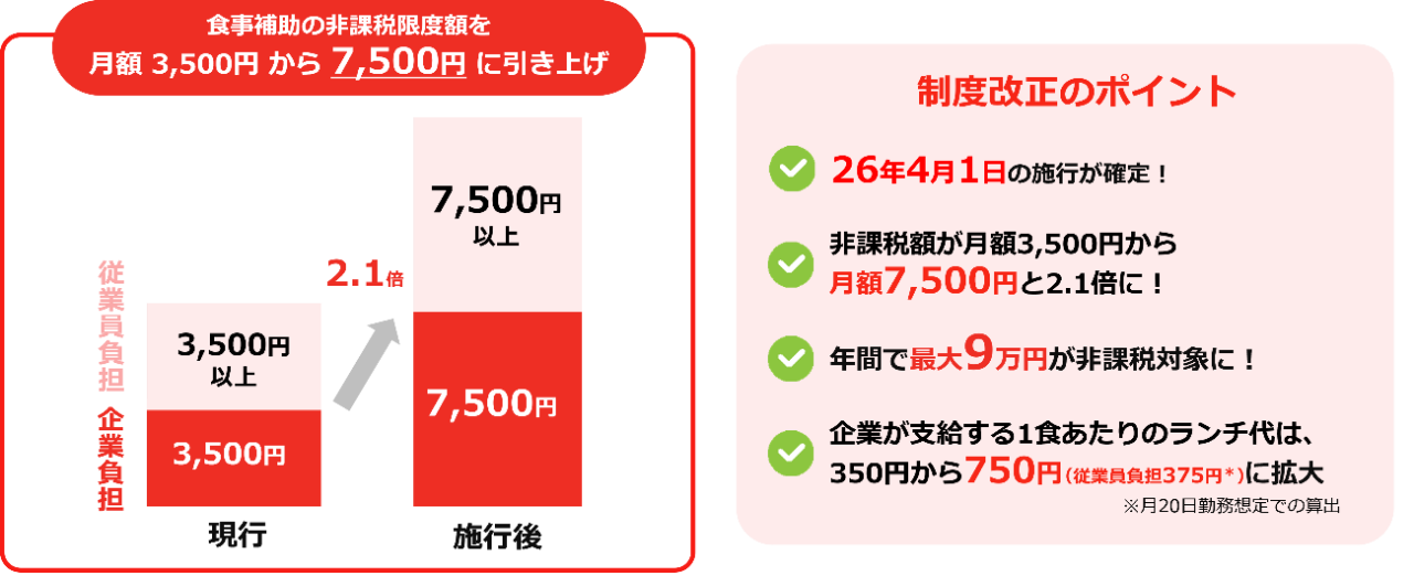 企業支給額と自己負担額を合わせると、月間で最大1万5,000円の食事代が利用可能になります。これを1日あたりの補助額に換算すると、これまでの350円から750円へと大幅にアップする計算です。
